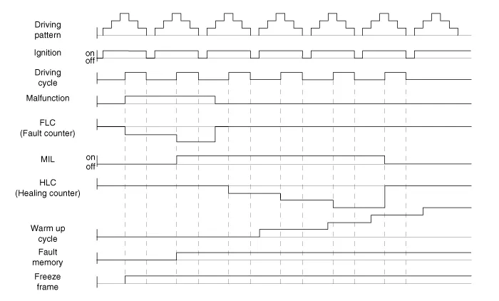 A Diagnostic Trouble Code(DTC) is recorded in ECM memory when a malfunction is detected after two sequential driving cycles. The MIL will illuminate when the malfunction is detected on the second driving cycle. If a misfire is detected, a DTC will be recorded, and the MIL will illuminate, immediately after a fault is first detected. |