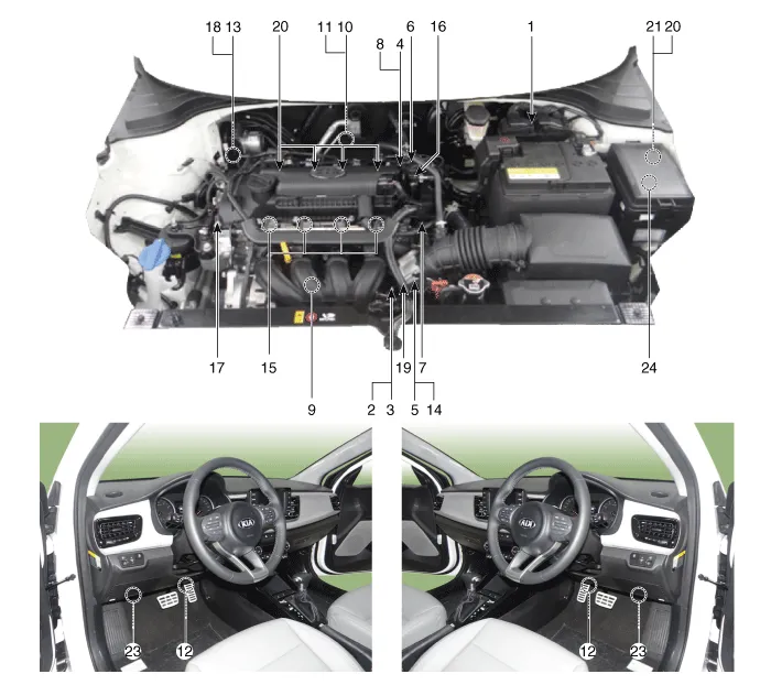 (APT) 14. ETC Motor [Integrated into ETC Module] 15 . Injector 16 . Purge Control Solenoid Valve (PCSV) 17 . Variable Fortce Solenoid (VFS) [Bank 1 / Intake] 18 . CVVT Oil Control Valve (OCV) [Bank 1 / Exhaust] 19. Variable Intake Solenoid (VIS) Valve 20 . Ignition Coil 21. Main Relay 22. Fuel Pump Relay 23. Data link Connector (DLC) [16 Pin] 24. Multi-Purpose Check Connector [6 Pin] |