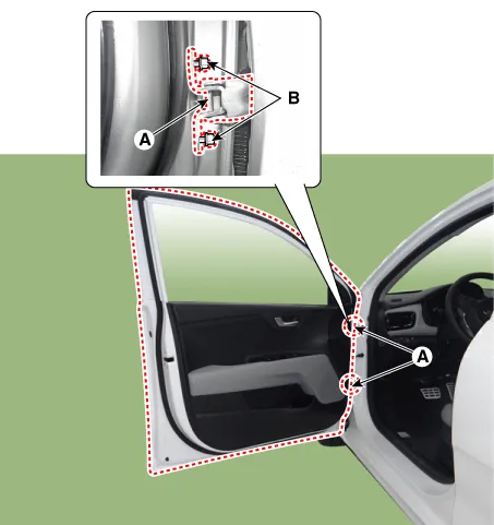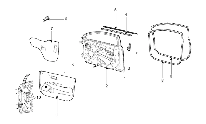 cover 7. Front door trim seal 8. Front door side weatherstrip 9. Front door body side weatherstrip 10. Front door hinge |