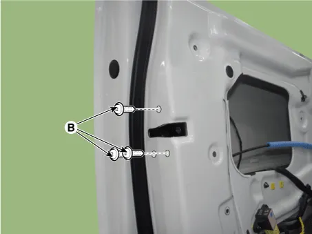 Remove the front door latch (A) after loosening the mounting screws (B).