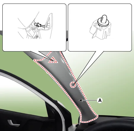 Components and components location Component Location 1. Center pillar lower trim 2. Center pillar upper trim Repair procedures Replacement [Center pillar lower trim] Put on gloves to protect your hands.