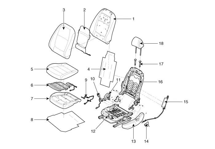 11. Front seat inner shield cover 12. Front seat cushion frame 13. Front seat outer shield cover 14. Front seat recliner knob 15. Front seat side airbag (SAB) module 16. Front seat back frame 17. Front seat headrest guide 18. Front seat headrest |