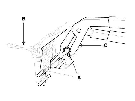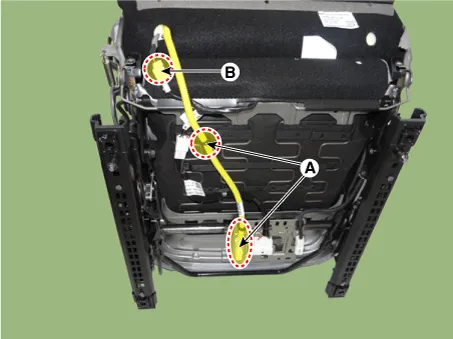 Disconnect the airbag connector mounting clip (A) and heater connector (B).