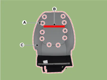 Remove the front seat back cover (C) from the front the seat back frame after removing the velcro tape (A) and hog-ring clips (B).