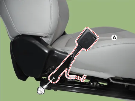Remove the front seat belt buckle (A) loosening the mounting bolt.