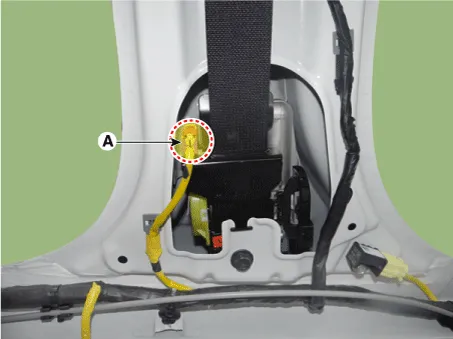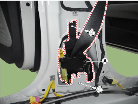 Remove the front seat belt retractor (A) after loosening the mounting bolts.
