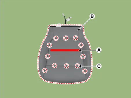 Remove the front seat cushion cover (C) from the front the seat cushion frame after removing the velcro tape (A) and hog-ring clips (B).