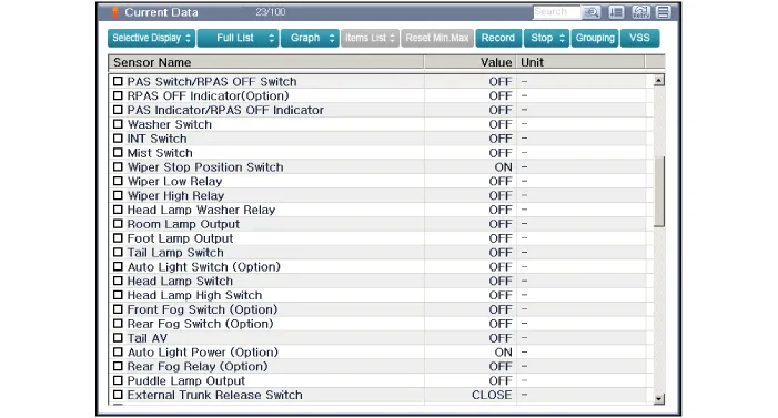 In the body electrical system, failure can be quickly diagnosed by using the vehicle diagnostic system (KDS/GDS). The diagnostic system(KDS/GDS) provides the following information.