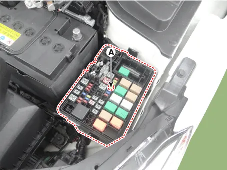 Disconnect the battery negative (-) terminal, and then install the fuel pump fuse (A). |