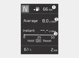 To clear the average fuel economy manually, press the RESET (for Type A cluster), OK ( for Type B cluster) (reset) on the steering wheel for more than 1 second when the average fuel economy is displayed.