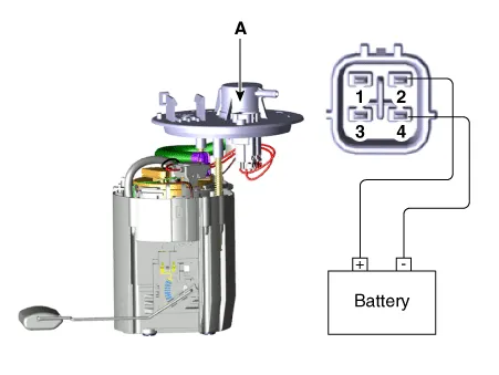 Check motor operation by fuel pump connector (A) connecting power(No.2) and ground(No.4)