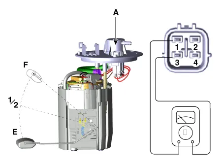 Using an ohmmeter, measure the resistance between terminals 1 and 3 of sender connector (A) at each float level.