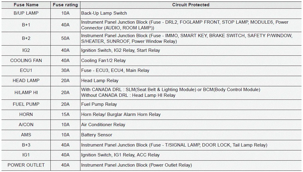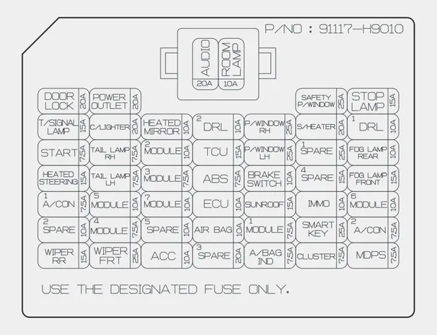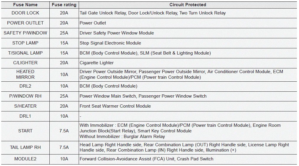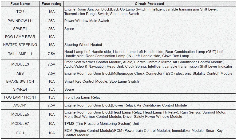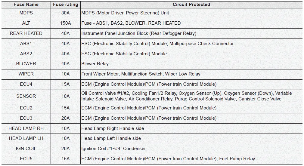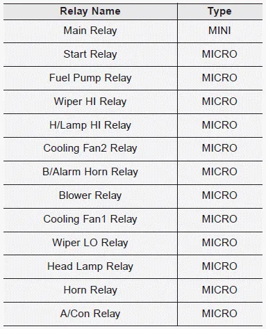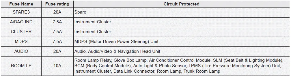 Inside the fuse/relay panel covers, you can find the fuse/relay label describing fuse/relay name and capacity.