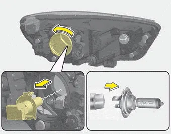 1. Open the hood. 2. Remove the bulb-socket from the headlamp assembly by turning the bulb-socket counterclockwise until the tabs on the bulb-socket align with the slots on the headlamp assembly.
