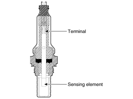 In order that this sensor normally operates, the temperature of the sensor tip must be higher than predetermined temperature. So it has a heater which is controlled by the ECM duty signal. When the exhaust gas temperature is lower than the specified value, the heater warms the sensor tip.