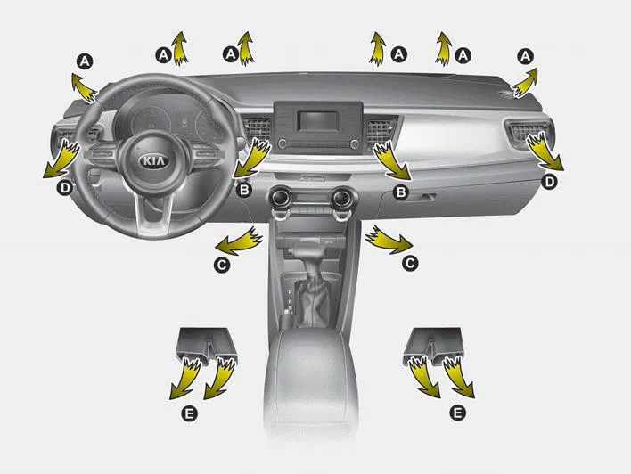 ■ Type A ■ Type B 1. Fan speed control knob 2. Mode selection knob 3. Temperature control knob 4. Air conditioning button (if equipped) 5.