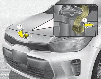 2. Go to the front of the vehicle, raise the hood slightly, push the secondary latch (1) inside of the hood center and lift the hood (2).