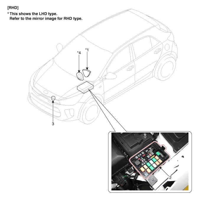 The relay on the horn of this vehicle is built into the engine room relay block. |