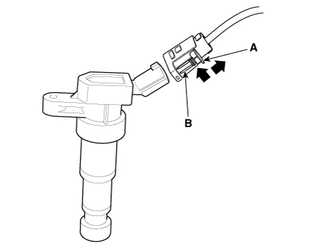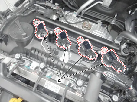 Remove the ignition coil (A) after loosening the mounting bolts.