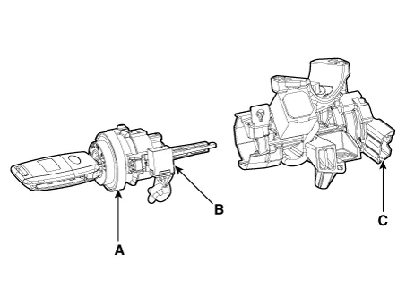 Disconnect the key warning switch connector (A) and ignition switch connector (B) from the steering column.
