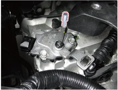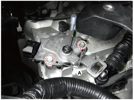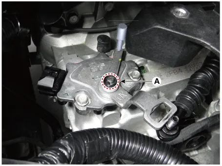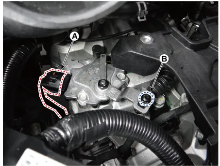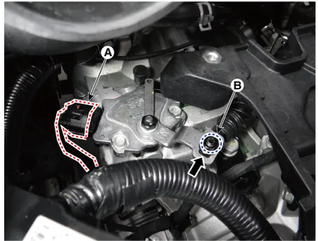 Disconnect the inhibitor switch connector (A) and loosen the shift cable mounting nut (B).