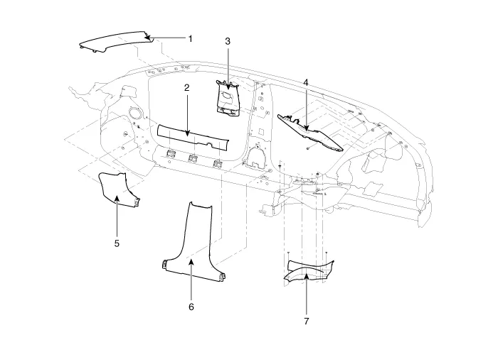 2. Front door scuff trim assembly 3. Center pillar upper trim assembly 4. Rear pillar trim assembly |