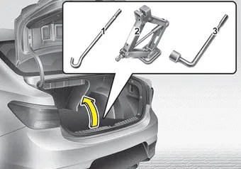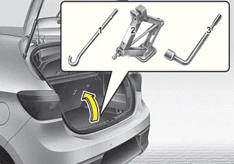 The spare tire, jack, jack handle and wheel lug nut wrench are stored in the luggage compartment.
