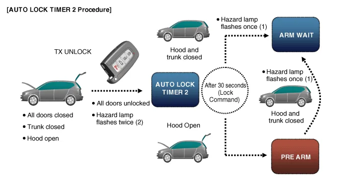 Timer 2 is completed and all doors are closed. 1-2. If the driver closes hood or tailgate, hazard lamp blinks one time and then the vehicle automatically enters "ARM" mode via "ARM WAIT" mode. 2-1. If LOCK button is pressed while at least one of all doors, hood and tailgate is open, "PRE ARM" mode turns on. 2-2. Because all doors locking signal is issued but the conditions for "ARM WAIT" are not satisfied, the vehicle remains in standby mode and enters ARM mode via ARM WAIT mode as soon as the door being open is closed. 2-3. In case intrusion is detected in PRE ARM mode, the vehicle turns into DISARM mode. 2-4. Security indicator keeps blinking in PRE ARM mode. |