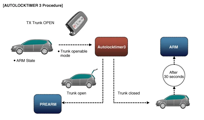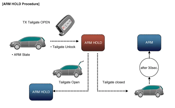 Note 2: When using the ignition key to open the tailgate, the ARM HOLD function works in the same way, provided that the "Door Key Burglar Alarm" function should be enabled. if this is disabled, the key-based ARM HOLD is off and using the key to opening the tailgate is determined as a theft and the alarm is issued.
