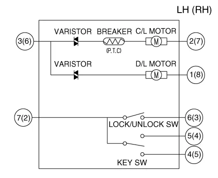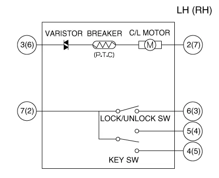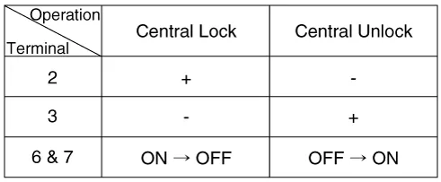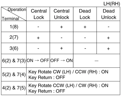 Check actuator operation by connecting power and ground as shown below. To prevent damage to the actuator, apply battery voltage only momentarily. [Central Lock Motor]