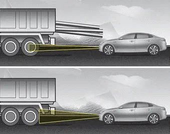 If the vehicle in front of you has cargo that extends rearward from the cab, or when the vehicle in front of you has higher ground clearance, additional special attention is required. FCA system may not be able to recognize the cargo extending from the vehicle. In these instances, you must maintain a safe braking distance from the rearmost object, and if necessary, depress the brake pedal to reduce your driving speed in order to maintain distance.