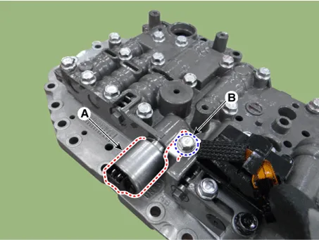 Remove the line pressure control solenoid valve (A) after removing the support bracket by loosening a bolt (B).