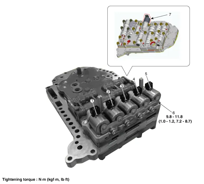 valve (PCSV-B) 6. Solenoid valve support bracket 7. Line pressure control solenoid valve (LINE_VFS) |