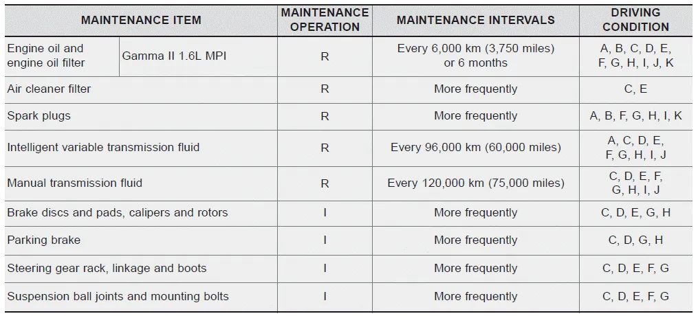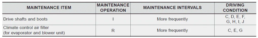 The following items must be serviced more frequently on cars normally used under severe driving conditions. Refer to the chart below for the appropriate maintenance intervals.