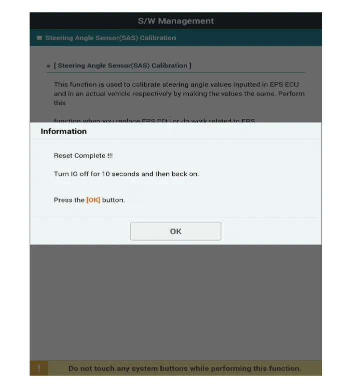 Select the "Steering Angle Sensor (SAS) Calibration" on KDS screen, then select OK. |