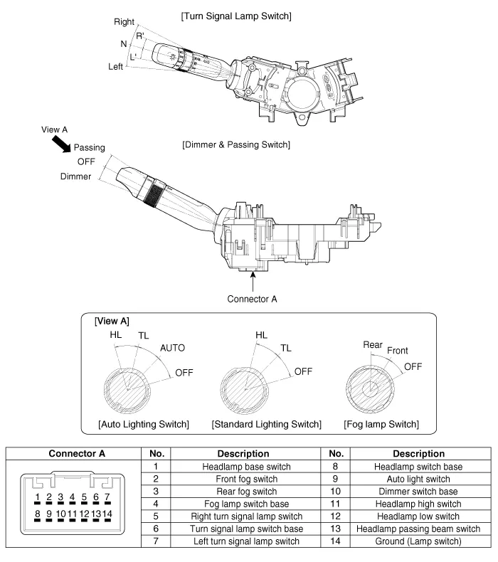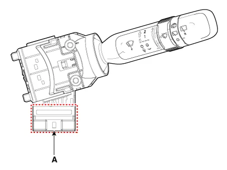 Disconnect the turn signal lamp switch / dimmer & passing switch connector (A).