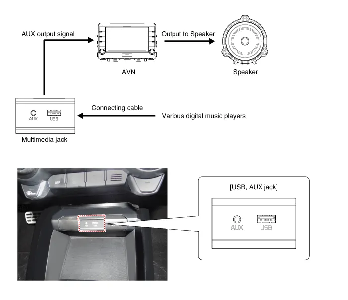 The multimedia jack on the console upper cover is for customers who like to listen to external portable music players like the MP3 etc., through the vehicle's sound system when it is linked to this jack. The customer has this added option.