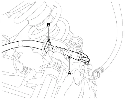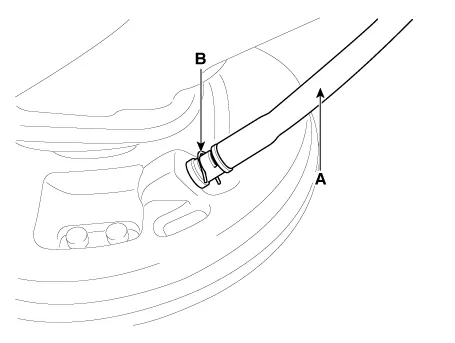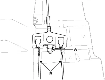 Loosen the adjusting nut (A) and the parking brake cables (B).