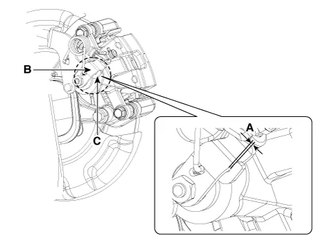 Tension the parking brake cable by tightening the adjusting nut, until the operating levers on both calipers lift from the stop, up to a distance of (A) between operating lever (B) and stopper (C).
