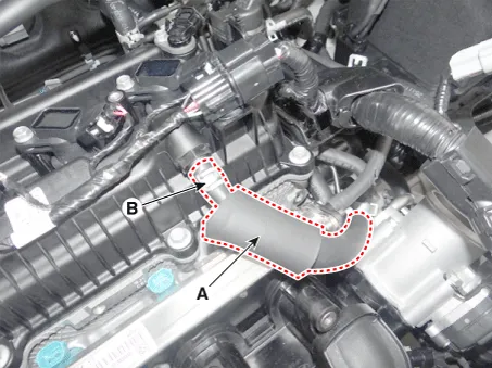 Disconnect the vapor hose (A) and then remove the PCV valve (B).