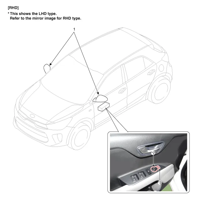 Components and components location Component Driver Power Window Switch Schematic diagrams Circuit Diagram [Non-Folding Mirror Type] [Folding Mirror Type] Repair procedures Removal 1.