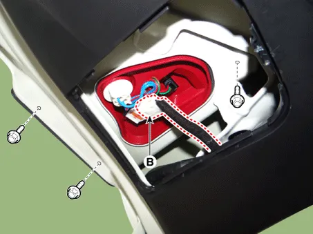 Disconnect the connector (B) and then remove the rear combination lamp (A) after loosening the nuts.