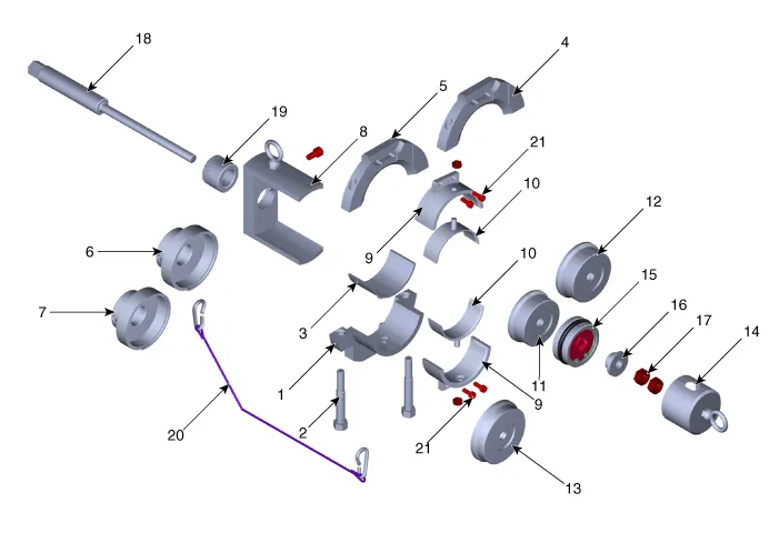 Assemble the main bolt (A) and the main nut (B), then insert it into the beam clamp support (C).