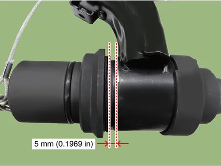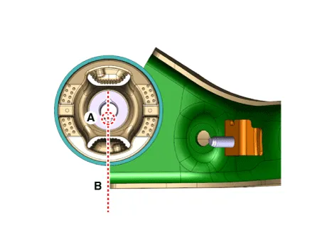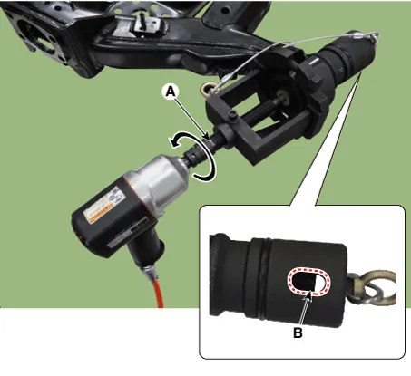 Install until it has 5 mm (0.1969 in) gap between the bush and torsion beam axle by rotating the main bolt (A) counterclockwise with air impact wrench. In this procedure check if the nut is loosening or not by eyesight through the hole of cap (B). And if the nut is loosening then re-tighten by regulated torque.