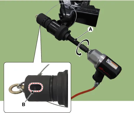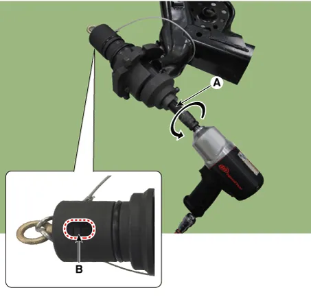 Remove the bush by rotating the main bolt (A) counterclockwise using by air impact wrench. In this procedure check if the nut is loosening or not by eyesight through the hole of cap (B). And if the nut is loosening then re-tighten by regulated torque.