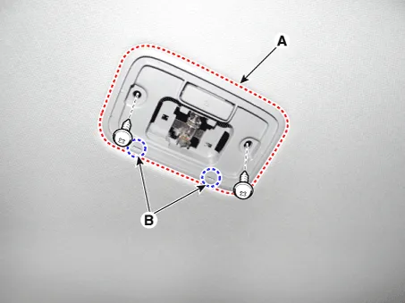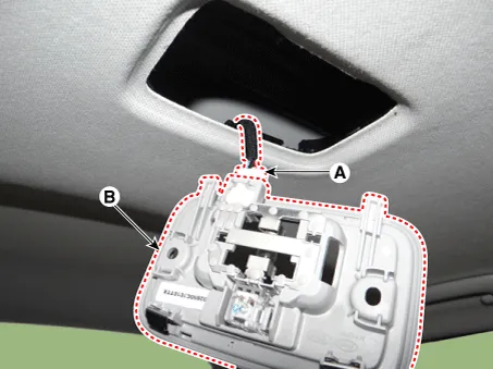 Remove the room lamp assembly (B) after disconnecting the room lamp connector (A).