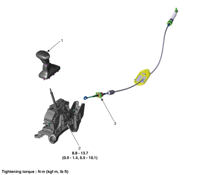 Components and components location Components 1. Shift lever knob & boots 2. Shift lever assembly 3. Shift cable assembly Repair procedures Removal 1.