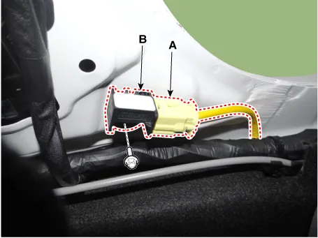 Connect the side impact sensor connector (A) and then tighten the bolt (B).