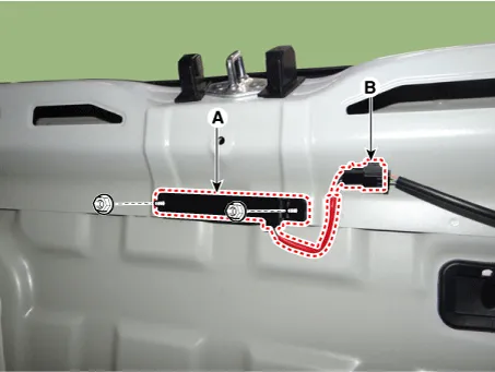 Remove the tailgate antenna (A) after loosening the mounting nuts and disconnecting the connector (B).