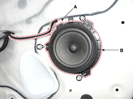 Remove the front door speaker (B) after disconnecting the connector (A) and loosening the bolts.